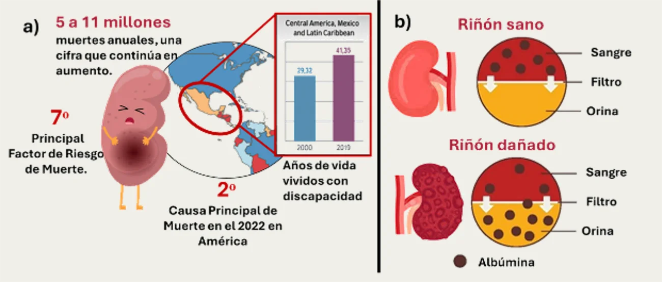 Figura 1:a) Crecimiento de las enfermedades renales a nivel global, impacto en América y México. b) Presencia de albúmina en la orina asociada a daño renal.