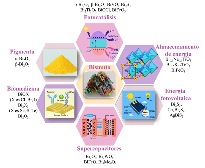 Figura 1: Aplicaciones de materiales a base de bismuto en industria, biomedicina, medio ambiente y energía.